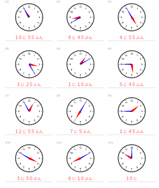 5分単位の時計の読み方の練習問題が出題されます。