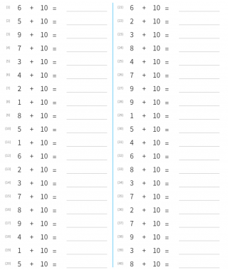 小学1年生算数足し算繰り上がり1~9の数に10を足す計算が出題されます。