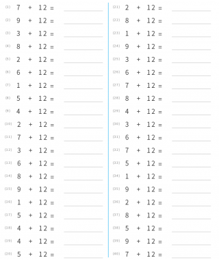 小学1年生算数足し算繰り上がり1~9の数に12を足す計算が出題されます。