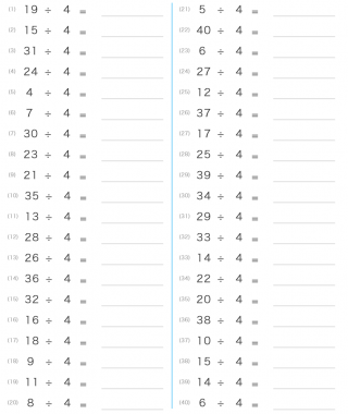 小学3年生算数割り算余りあり4で割る練習が出題されます。