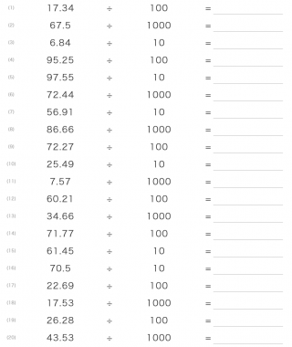 小数を含む数(1より小さい値)を10・100・1000で割る問題が出題されます。