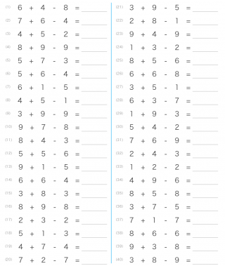 小学1年生算数足し算引き算3つの数の足し算と引き算の計算練習が出題されます。