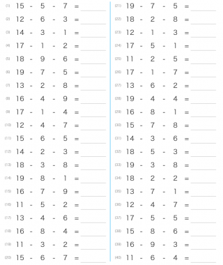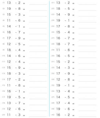 【繰り下がりありなし混合】2桁(19まで)-1桁