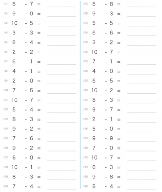 小学1年生算数引き算就学前10以内の引き算(0を含む)が出題されます。
