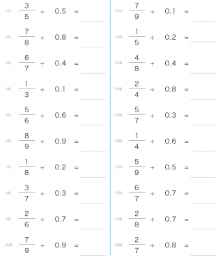 小学6年生算数掛け算割り算分数小数帯分数約分分数÷分数×小数の計算が出題されます。