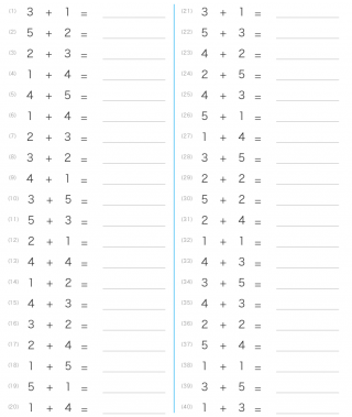1~5の範囲+1~5の範囲(片手+片手)の足し算が出題されます。