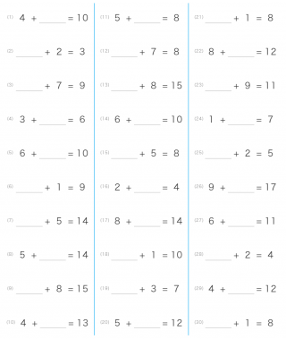 小学1年生算数足し算繰り上がり虫食い算合計19までの足し算が出題されます。
